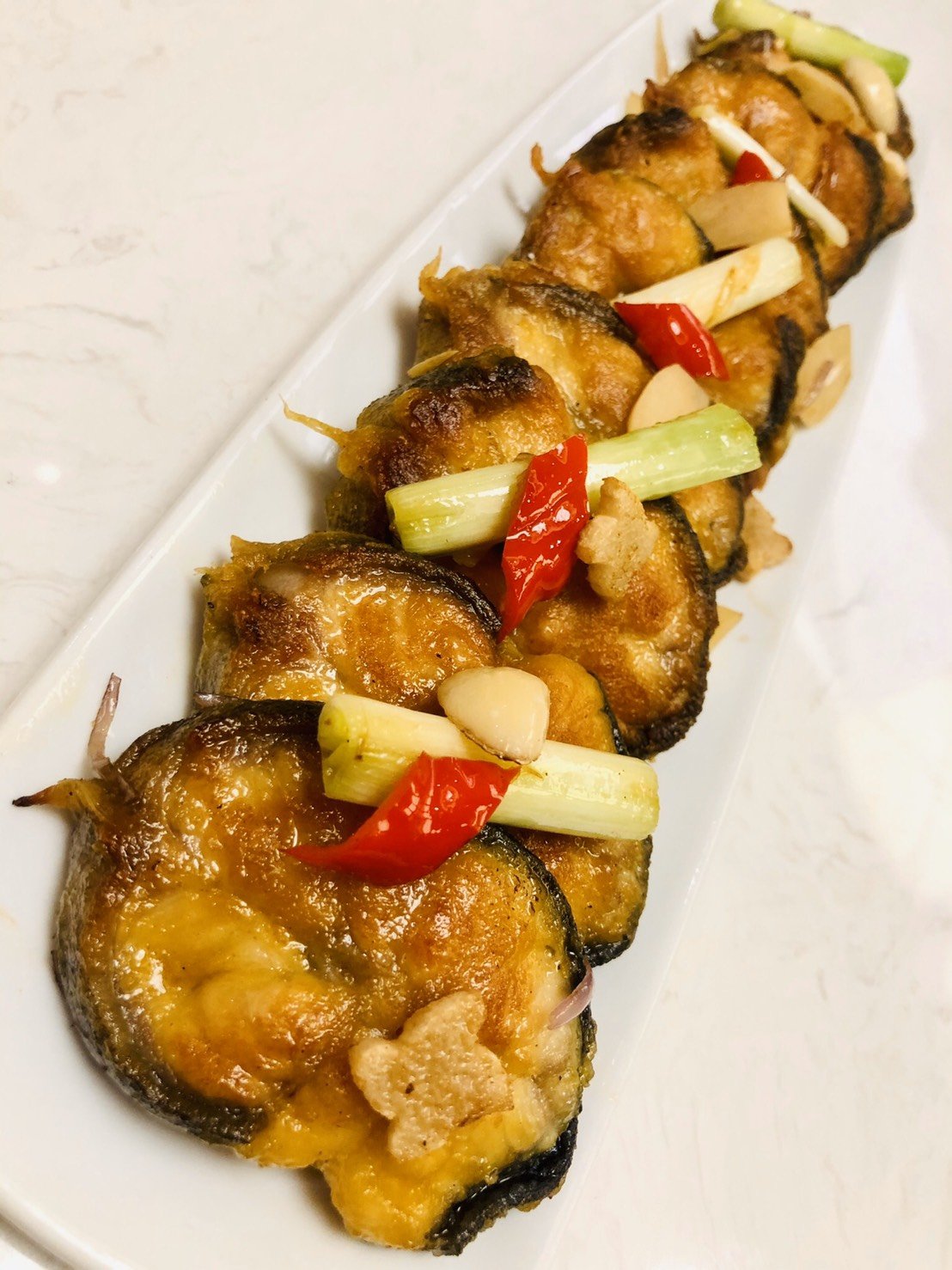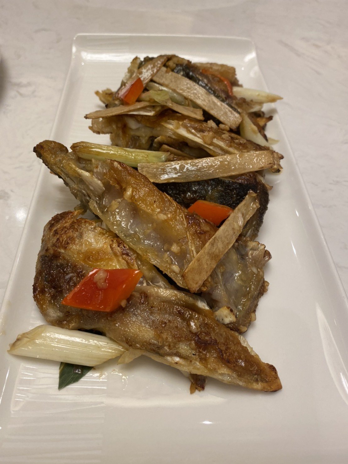 「薑蔥煎焗魚頭」香酥惹味,製作時需先將處理乾淨的大鰱魚頭以獨門特製醃料醃過,再煎焗至微焦香脆,引人吮骨啜肉,胃口大開;