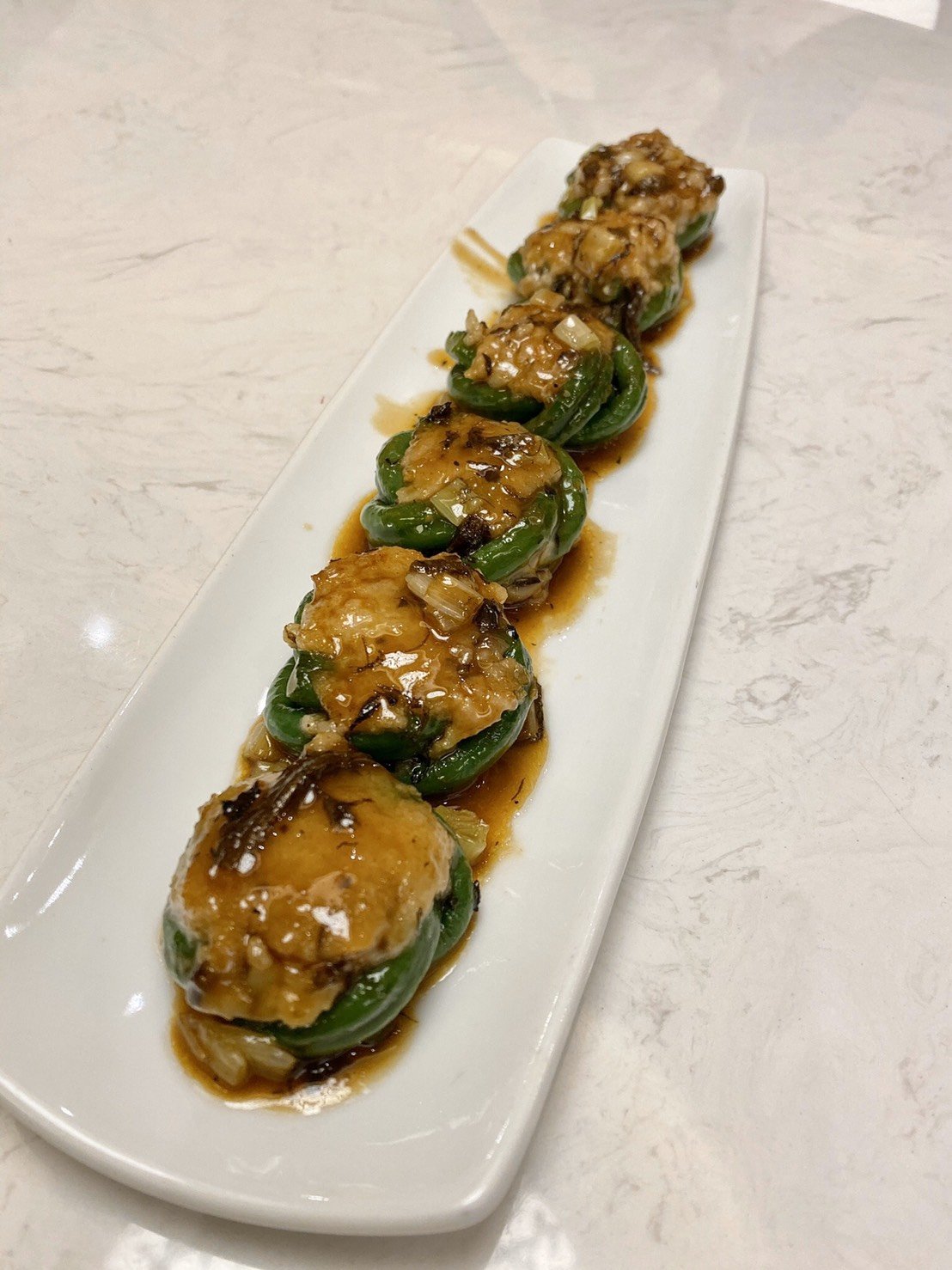順德菜中的煎釀菜色亦不容錯過。「順德釀豆角」將長豆煮軟冰鎮手工打結後,填入主廚特製,包含豬肉蓉與河蝦泥的釀料,並以欖菜點睛;「煎釀虎皮椒」則以白蝦泥為釀料香煎而成,甘甜鹹香。