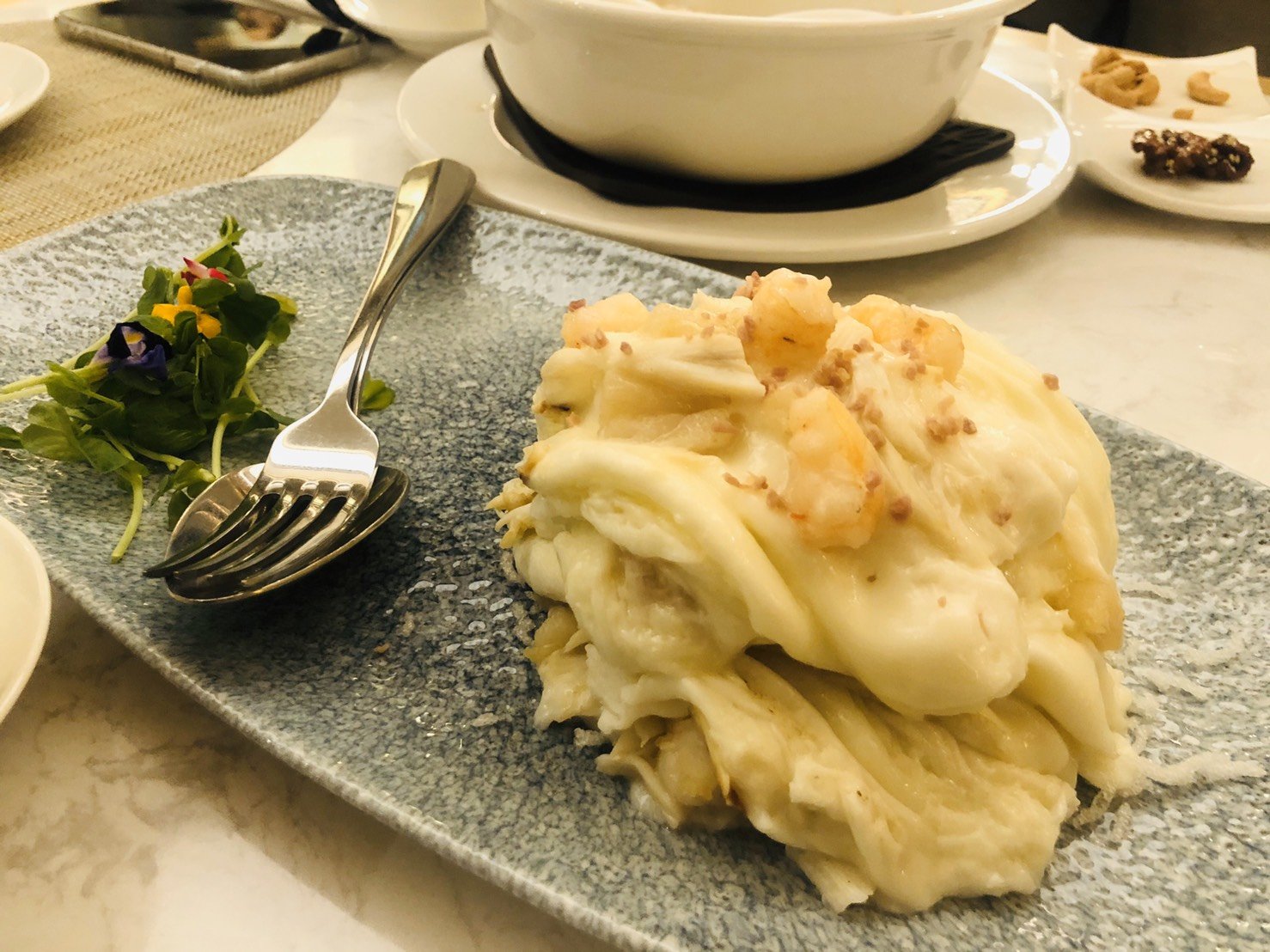 「順德煎焗風鱔」亦是一道十分考驗火候的菜色,主廚使用口感極佳的河鰻,悉心清洗乾淨後切片,以獨家煎焗醬醃製,下鍋先煎酥表面,再搭配薑蔥等辛香食材焗熟,保持食物原味之餘,香煎過的切面酥香順口,爽口鮮甜。